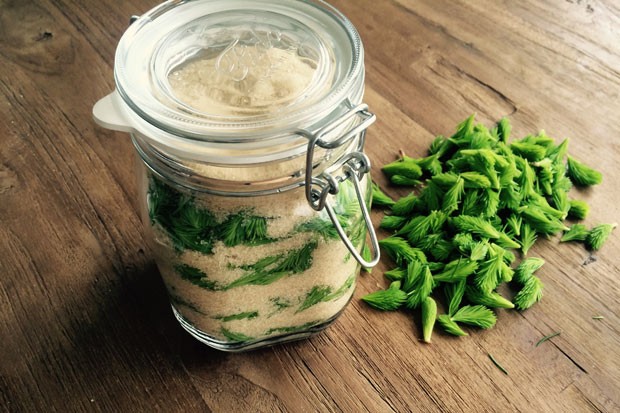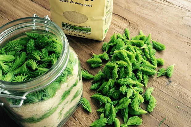 - Diese jungen, höchstens 3 cm langen Triebe werden gewaschen und abwechselnd mit dem Zucker in ein verschließbares Glas gefüllt. Die letzte Schicht muss aus Zucker bestehen.